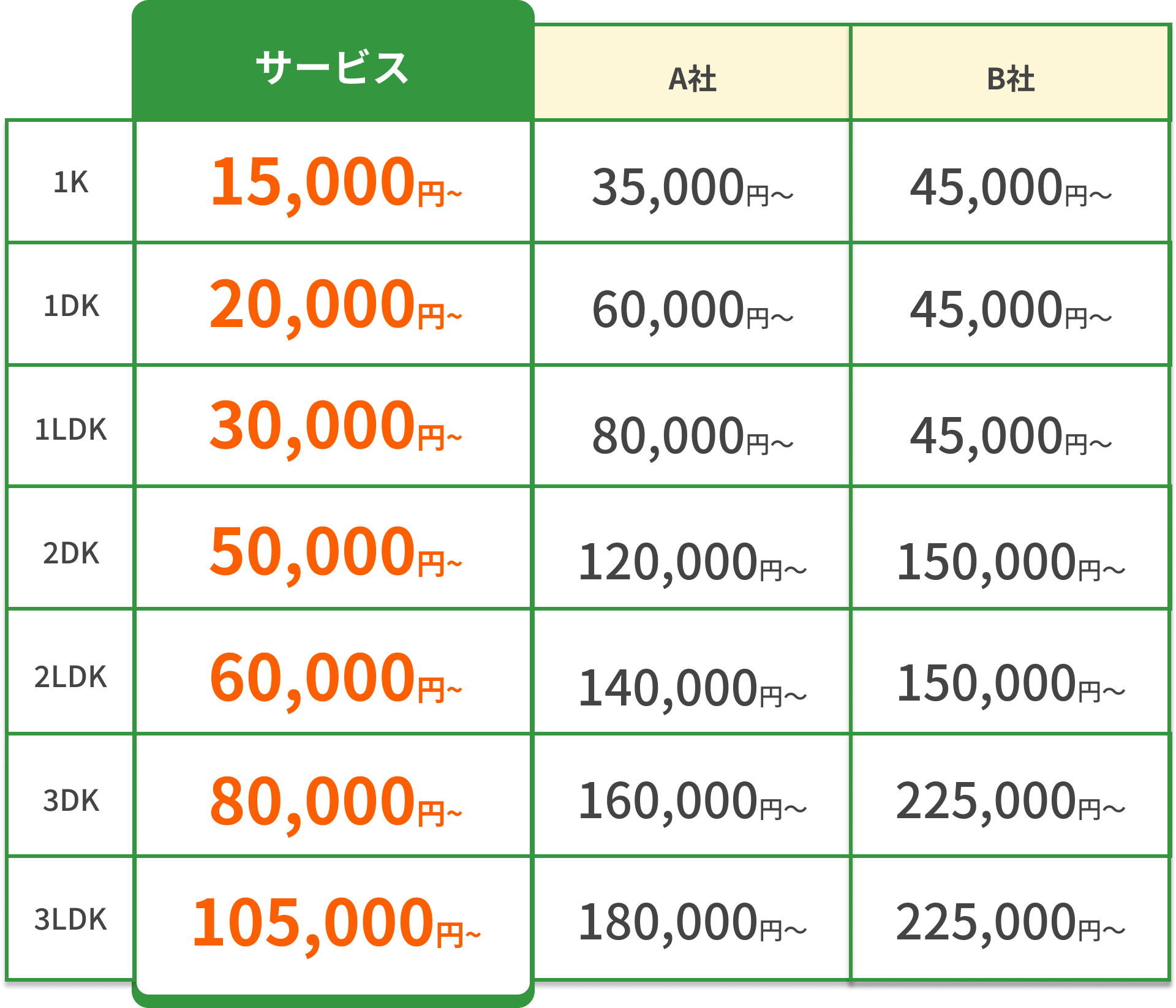 見積もり後の追加料金ゼロ。階段料金・駐車場代も全て込み。他社より高ければ即座にお値引きします。